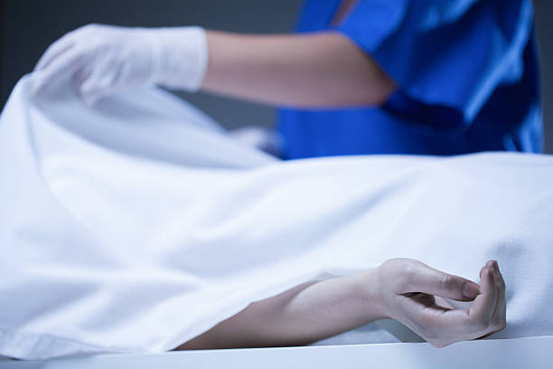 Worker of morgue covering corpse by sheet