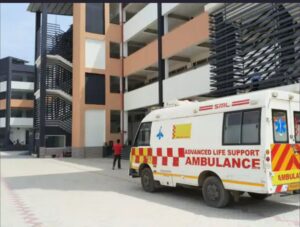 स्कूल के अन्दर खड़ी एंबुलेंस।