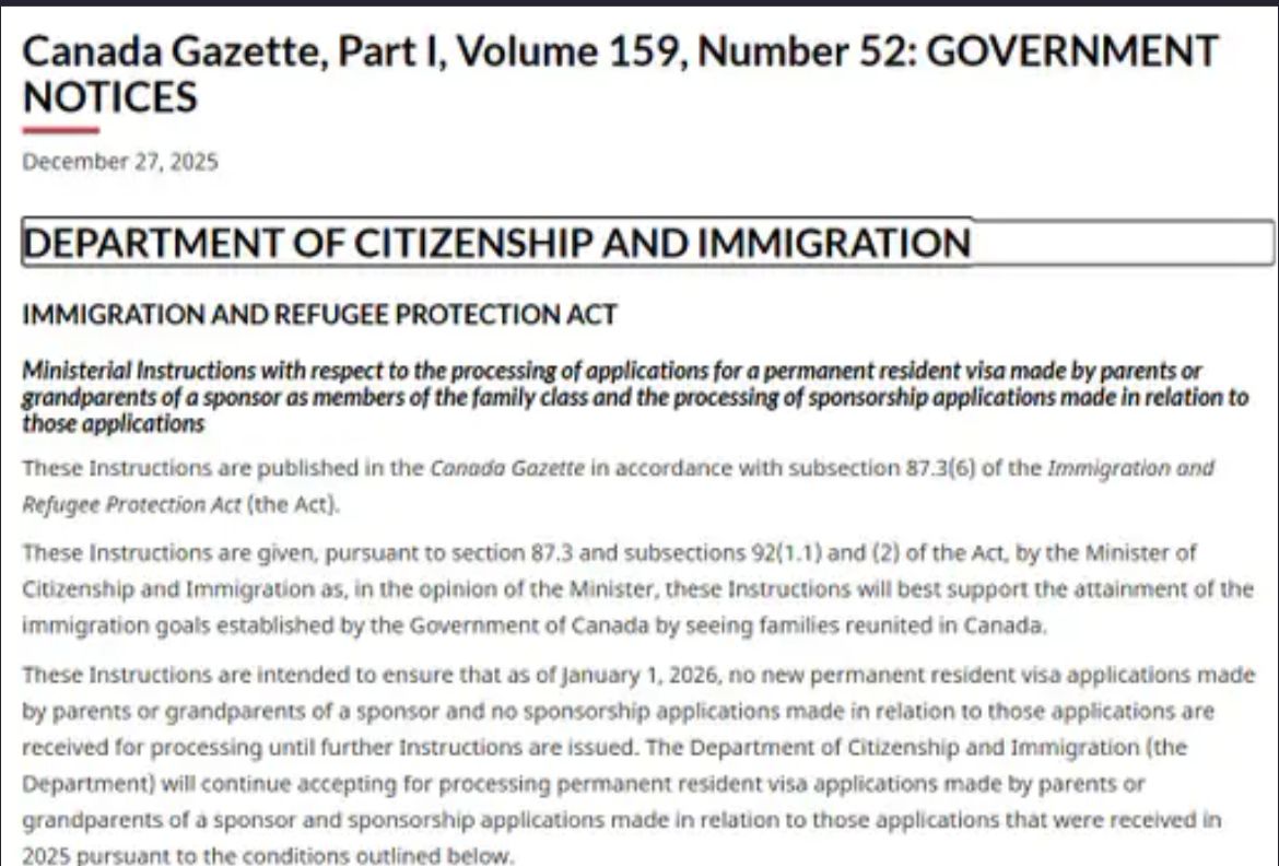 कनाडा इमिग्रेंट डिपार्टमेंट ने केवल बुजुर्गों की PR पर रोक लगाई है। कनाडा जाने पर रोक नहीं है। अगर वे घूमने या कुछ समय तक जाना चाहते हैं तो ऐसे वीजा पर कोई रोक नहीं रहेगी।कनाडा सरकार 2026-2028 के लिए PR की संख्या कम कर रही है। इस कटौती के तहत माता-पिता और दादा-दादी को बुलाने वाले प्रोग्राम (PGP) के नए आवेदनों को रोका गया है। 2025 में PGP के तहत नए आवेदन नहीं लिए जा रहे हैं। केवल 2024 में सबमिट किए गए आवेदनों को ही प्रोसेस किया जाएगा। साल 2024 में, कनाडा ने माता-पिता और दादा-दादी कार्यक्रम (PGP) के तहत लगभग 27,330 नए PR वीजा दिए थे। इसके अलावा कनाडा सरकार ने अपना केयरगिवर कार्यक्रम को भी बंद कर दिया है।