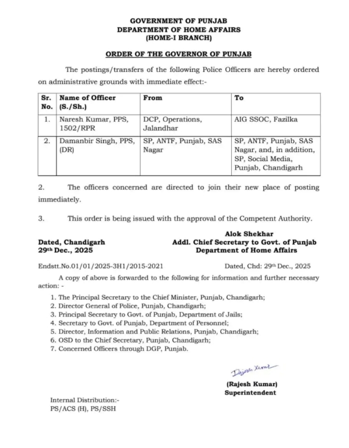 रोजाना मेल (न्यूज डेस्क): जालंधर के पुलिस विभाग में प्रशासनिक फेरबदल के तहत जालंधर के डीसीपी नरेश डोगरा का तबादला कर दिया गया है। उन्हें AIG स्टेट स्पेशल ऑपरेशन सैल (SSOC) फाजिल्का नियुक्त किया गया है। यह आदेश उस समय आए जब एक दिन पहले ही लंबे समय के बाद जालंधर सेंट्रल के विधायक रमन अरोड़ा की सदन में एंट्री हुई।