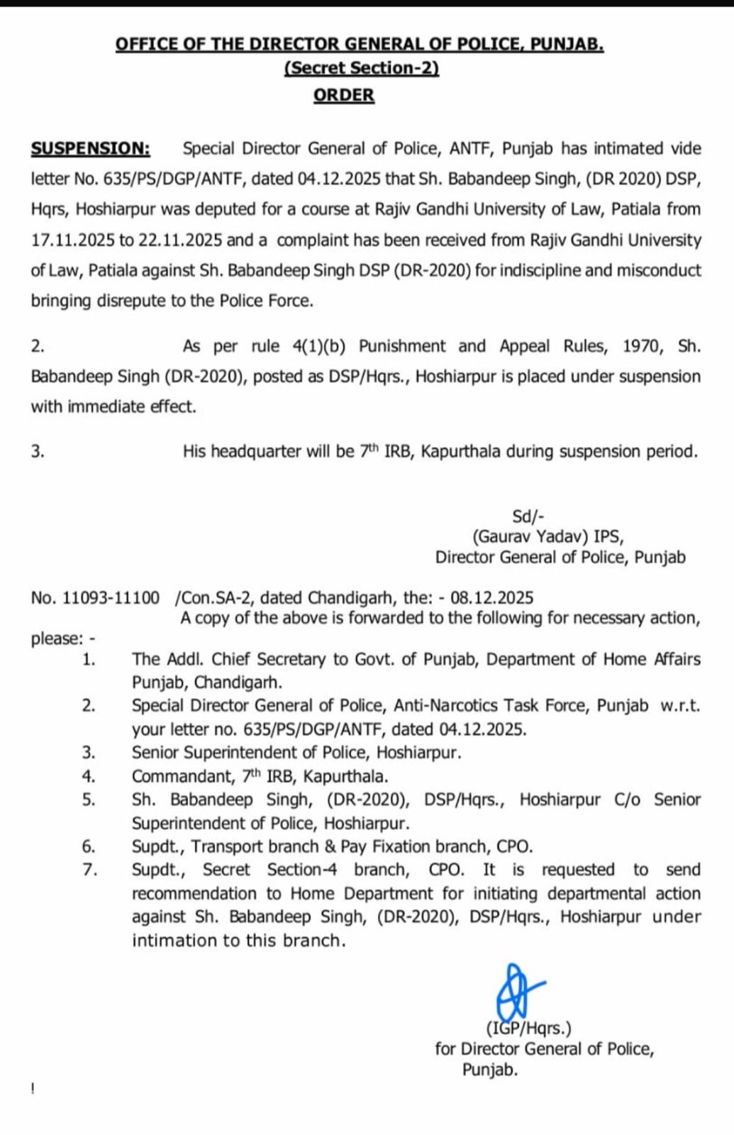 एसीपी कैंट रहे बबनदीप सिंह इस समय होशियारपुर हैड क्वाटर डीएसपी थे। जानकारी अनुसार उन पर आरोप लगे है कि पटियाला में राजीव गांधी यूनिवर्सिटी ऑफ लॉ में पांच दिन के कोर्स दौरान डीएसपी बबनदीप सिंह ने कुछ ऐसी हरकतें की जिससे पंजाब पुलिस बल का नाम खराब और बदनाम हुआ। ऐसे में उन्होंने तुरंत प्रभाव से सस्पेंड कर दिया गया।