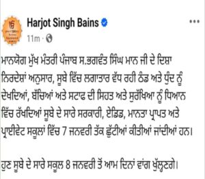 रोजाना मेल (न्यूज डेस्क): पंजाब में बढ़ रहे सर्दी के प्रकोप के कारण अब सभी स्कूलों में छुट्टियां बढ़ गई है। अब सभी प्राइवेट और सरकारी, एडिड और मान्यता प्राप्त स्कूल 8 जनवरी को खुलेंगे। यह ऐलान शिक्षा मंत्री हरजोत सिंह बैंस ने किया है।