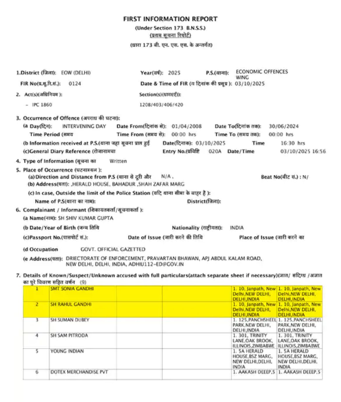 रोजाना मेल (न्यूज डेस्क): दिल्ली पुलिस की आर्थिक अपराध शाखा (EOW) ने नेशनल हेराल्ड केस में सोनिया गांधी और राहुल गांधी के खिलाफ नई एफआईआर दर्ज की है। इसमें उनके अलावा छह अन्य लोगों और तीन कंपनियों के नाम शामिल हैं। ये तीन कंपनियां हैं- AJL, डोटेक्स मर्चेंडाइज और यंग इंडियन। इन सभी पर एसोसिएटेड जर्नल्स लिमिटेड (AJL) को धोखाधड़ी से हासिल करने का आरोप है।