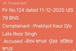 जानकारी अनुसार एक दिसंबर को एएस विला की रहनी वाली सखी मैनेजमेंट ग्रुप से प्रभजोत कौर ने सीपी को शिकायत दी थी कि रेलवे स्टेशन पर जब वह खाना खाने गए तो रंजम नाम के युवक ने उनके साथ गलत हरकतें की, उनकी गरिमा और लज्जा को ठेस पहुंचाने के लिए अपने फेसबुक पेज पर उनकी वीडियो वायरल की थी व गाड़ी की जबरी चैकिंग भी करवाई थी। मामला सीपी के ध्यान में आया तो महिला थाने की पुलिस को शिकायत मार्क की गई जिसकी जांच के बाद महिला थाने की पुलिस ने रंजम थापर पुत्र नरेंद्र थापर निवासी खिलाफ एफआईआर नंबर 124 तिथि 11- 12- 2025 धारा 79 BNS के अधीन केस दर्ज कर लिया है। पुलिस का कहना है कि जल्द ही रंजम को गिरफ्तार किया जाएगा।