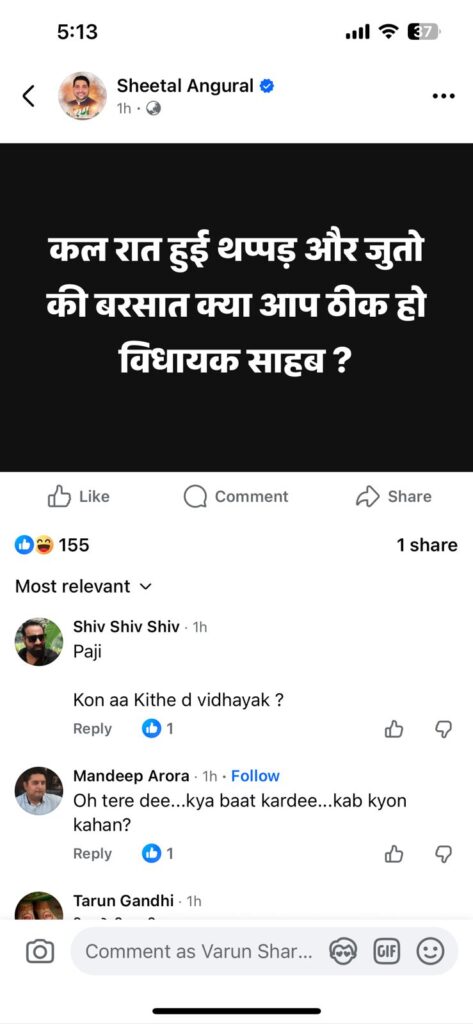 यह दावा पूर्व विधायक और बीजेपी नेता शीतल अंगूराल ने किया। शीतल ने अपने फेसबुक पेज पर यह पोस्ट डाली और लिखा कि कल रात हुई थप्पड़ और जूतों की बरसात… क्या आप ठीक हो विधायक साहब। हालांकि शीतल अंगूराल से पूछा गया तो उन्होंने कहा कि जल्द इसका खुलासा किया जाएगा। वहीं शीतल की इस पोस्ट से राजनीतिक लॉबी में तहलका मचा हुआ है। सभी विधायक दावा कर रहे है कि उनका इस पोस्ट से कोई लेनदेन नहीं। शीतल अब जल्द इस पोस्ट को लेकर खुलासा करने का दावा कर रहे हैं।